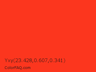 Yxy 23.428,0.607,0.341 Color is a normal red color and the nearest color is Red RYB #fe2712. Hex code #fc361e and RGB value is rgb(252,54,30). In RGB color space, this color is composed of 99% red, 21% green, 12% blue, In CMYK color space, this color is composed of 0% cyan, 79% magenta, 88% yellow , 1% black , In HSL color space, this color has a hue angle of 6° , 97% saturation and 55% lightness.