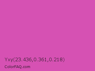 Yxy 23.436,0.361,0.218 Color is a normal magenta color and the nearest color is Fuchsia Pink #c154c1. Hex code #d651b3 and RGB value is rgb(214,81,179). In RGB color space, this color is composed of 84% red, 32% green, 70% blue, In CMYK color space, this color is composed of 0% cyan, 62% magenta, 16% yellow , 16% black , In HSL color space, this color has a hue angle of 316° , 62% saturation and 58% lightness.