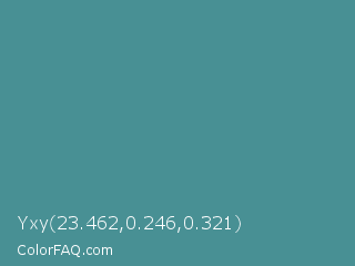 Yxy 23.462,0.246,0.321 Color is a normal cyan color and the nearest color is Smalt Blue #51808f. Hex code #489094 and RGB value is rgb(72,144,148). In RGB color space, this color is composed of 28% red, 56% green, 58% blue, In CMYK color space, this color is composed of 51% cyan, 3% magenta, 0% yellow , 42% black , In HSL color space, this color has a hue angle of 183° , 35% saturation and 43% lightness.