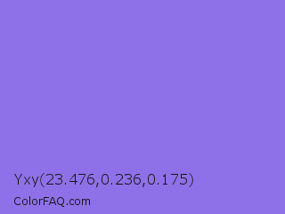 Yxy 23.476,0.236,0.175 Color is a light indigo color and the nearest color is Medium Purple #9370db. Hex code #8e71e8 and RGB value is rgb(142,113,232). In RGB color space, this color is composed of 56% red, 44% green, 91% blue, In CMYK color space, this color is composed of 39% cyan, 51% magenta, 0% yellow , 9% black , In HSL color space, this color has a hue angle of 255° , 72% saturation and 68% lightness.