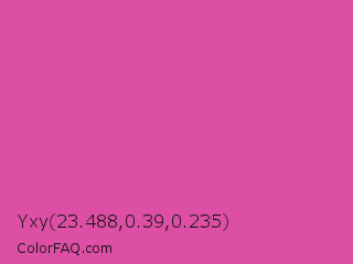 Yxy 23.488,0.39,0.235 Color is a normal magenta color and the nearest color is Raspberry Pink #e25098. Hex code #dc4fa4 and RGB value is rgb(220,79,164). In RGB color space, this color is composed of 86% red, 31% green, 64% blue, In CMYK color space, this color is composed of 0% cyan, 64% magenta, 25% yellow , 14% black , In HSL color space, this color has a hue angle of 324° , 67% saturation and 59% lightness.