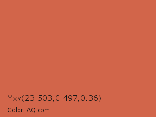 Yxy 23.503,0.497,0.36 Color is a normal red color and the nearest color is Jelly Bean #da614e. Hex code #d2654a and RGB value is rgb(210,101,74). In RGB color space, this color is composed of 82% red, 40% green, 29% blue, In CMYK color space, this color is composed of 0% cyan, 52% magenta, 65% yellow , 18% black , In HSL color space, this color has a hue angle of 12° , 60% saturation and 56% lightness.