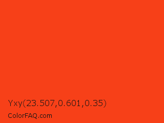 Yxy 23.507,0.601,0.35 Color is a normal red color and the nearest color is Pomegranate #f34723. Hex code #f74018 and RGB value is rgb(247,64,24). In RGB color space, this color is composed of 97% red, 25% green, 9% blue, In CMYK color space, this color is composed of 0% cyan, 74% magenta, 90% yellow , 3% black , In HSL color space, this color has a hue angle of 11° , 93% saturation and 53% lightness.