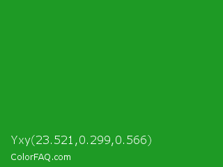 Yxy 23.521,0.299,0.566 Color is a normal green color and the nearest color is Forest Green #228b22. Hex code #1e9a25 and RGB value is rgb(30,154,37). In RGB color space, this color is composed of 12% red, 60% green, 15% blue, In CMYK color space, this color is composed of 81% cyan, 0% magenta, 76% yellow , 40% black , In HSL color space, this color has a hue angle of 123° , 67% saturation and 36% lightness.