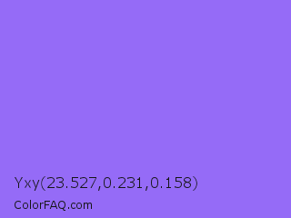 Yxy 23.527,0.231,0.158 Color is a light indigo color and the nearest color is Navy Purple #9457eb. Hex code #956bf7 and RGB value is rgb(149,107,247). In RGB color space, this color is composed of 58% red, 42% green, 97% blue, In CMYK color space, this color is composed of 40% cyan, 57% magenta, 0% yellow , 3% black , In HSL color space, this color has a hue angle of 258° , 90% saturation and 69% lightness.