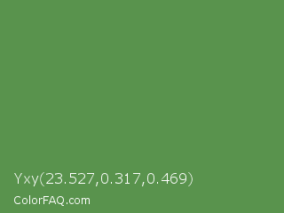 Yxy 23.527,0.317,0.469 Color is a normal green color and the nearest color is Middle Green #4d8c57. Hex code #59934d and RGB value is rgb(89,147,77). In RGB color space, this color is composed of 35% red, 58% green, 30% blue, In CMYK color space, this color is composed of 39% cyan, 0% magenta, 48% yellow , 42% black , In HSL color space, this color has a hue angle of 110° , 31% saturation and 44% lightness.