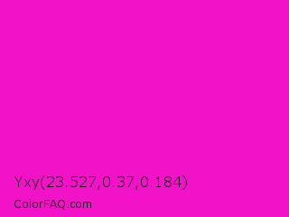 Yxy 23.527,0.37,0.184 Color is a normal magenta color and the nearest color is Shocking Pink #fc0fc0. Hex code #f213c9 and RGB value is rgb(242,19,201). In RGB color space, this color is composed of 95% red, 7% green, 79% blue, In CMYK color space, this color is composed of 0% cyan, 92% magenta, 17% yellow , 5% black , In HSL color space, this color has a hue angle of 311° , 90% saturation and 51% lightness.