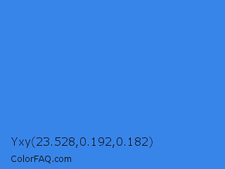 Yxy 23.528,0.192,0.182 Color is a normal blue color and the nearest color is Bleu De France #318ce7. Hex code #3885ea and RGB value is rgb(56,133,234). In RGB color space, this color is composed of 22% red, 52% green, 92% blue, In CMYK color space, this color is composed of 76% cyan, 43% magenta, 0% yellow , 8% black , In HSL color space, this color has a hue angle of 214° , 81% saturation and 57% lightness.