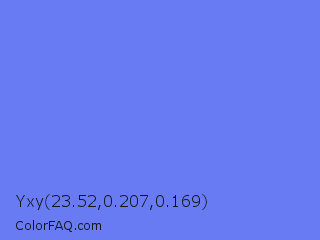Yxy 23.52,0.207,0.169 Color is a light blue color and the nearest color is Very Light Blue #6666ff. Hex code #687bf2 and RGB value is rgb(104,123,242). In RGB color space, this color is composed of 41% red, 48% green, 95% blue, In CMYK color space, this color is composed of 57% cyan, 49% magenta, 0% yellow , 5% black , In HSL color space, this color has a hue angle of 232° , 84% saturation and 68% lightness.