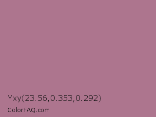 Yxy 23.56,0.353,0.292 Color is a normal rose color and the nearest color is Turkish Rose #b57281. Hex code #ad758e and RGB value is rgb(173,117,142). In RGB color space, this color is composed of 68% red, 46% green, 56% blue, In CMYK color space, this color is composed of 0% cyan, 32% magenta, 18% yellow , 32% black , In HSL color space, this color has a hue angle of 333° , 25% saturation and 57% lightness.