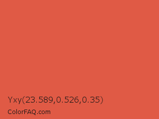 Yxy 23.589,0.526,0.35 Color is a normal red color and the nearest color is Jelly Bean #da614e. Hex code #e05a45 and RGB value is rgb(224,90,69). In RGB color space, this color is composed of 88% red, 35% green, 27% blue, In CMYK color space, this color is composed of 0% cyan, 60% magenta, 69% yellow , 12% black , In HSL color space, this color has a hue angle of 8° , 71% saturation and 57% lightness.