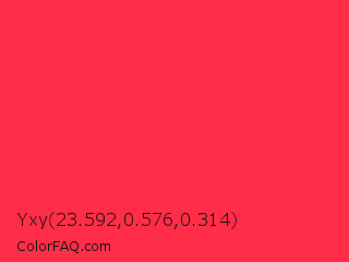 Yxy 23.592,0.576,0.314 Color is a normal red color and the nearest color is Red Salsa #fd3a4a. Hex code #ff2d47 and RGB value is rgb(255,45,71). In RGB color space, this color is composed of 100% red, 18% green, 28% blue, In CMYK color space, this color is composed of 0% cyan, 82% magenta, 72% yellow , 0% black , In HSL color space, this color has a hue angle of 353° , 100% saturation and 59% lightness.