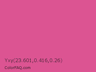 Yxy 23.601,0.416,0.26 Color is a normal rose color and the nearest color is Raspberry Pink #e25098. Hex code #dc5491 and RGB value is rgb(220,84,145). In RGB color space, this color is composed of 86% red, 33% green, 57% blue, In CMYK color space, this color is composed of 0% cyan, 62% magenta, 34% yellow , 14% black , In HSL color space, this color has a hue angle of 333° , 66% saturation and 60% lightness.