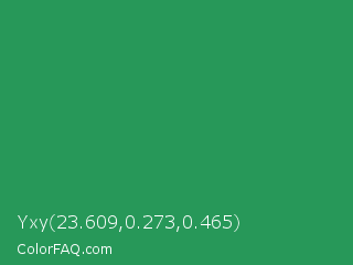 Yxy 23.609,0.273,0.465 Color is a normal green color and the nearest color is Eucalyptus #278a5b. Hex code #279859 and RGB value is rgb(39,152,89). In RGB color space, this color is composed of 15% red, 60% green, 35% blue, In CMYK color space, this color is composed of 74% cyan, 0% magenta, 41% yellow , 40% black , In HSL color space, this color has a hue angle of 147° , 59% saturation and 37% lightness.