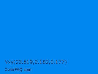 Yxy 23.619,0.182,0.177 Color is a normal blue color and the nearest color is Azure Radiance #007fff. Hex code #0087f0 and RGB value is rgb(0,135,240). In RGB color space, this color is composed of 0% red, 53% green, 94% blue, In CMYK color space, this color is composed of 100% cyan, 44% magenta, 0% yellow , 6% black , In HSL color space, this color has a hue angle of 206° , 100% saturation and 47% lightness.