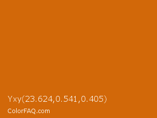 Yxy 23.624,0.541,0.405 Color is a normal orange color and the nearest color is Red Stage #d05f04. Hex code #d26809 and RGB value is rgb(210,104,9). In RGB color space, this color is composed of 82% red, 41% green, 4% blue, In CMYK color space, this color is composed of 0% cyan, 50% magenta, 96% yellow , 18% black , In HSL color space, this color has a hue angle of 28° , 92% saturation and 43% lightness.