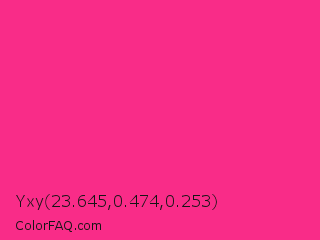 Yxy 23.645,0.474,0.253 Color is a normal rose color and the nearest color is Wild Strawberry Crayola #ff3399. Hex code #f92c88 and RGB value is rgb(249,44,136). In RGB color space, this color is composed of 98% red, 17% green, 53% blue, In CMYK color space, this color is composed of 0% cyan, 82% magenta, 45% yellow , 2% black , In HSL color space, this color has a hue angle of 333° , 94% saturation and 57% lightness.