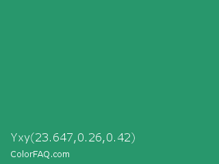 Yxy 23.647,0.26,0.42 Color is a normal green color and the nearest color is Illuminating Emerald #319177. Hex code #28976c and RGB value is rgb(40,151,108). In RGB color space, this color is composed of 16% red, 59% green, 42% blue, In CMYK color space, this color is composed of 74% cyan, 0% magenta, 28% yellow , 41% black , In HSL color space, this color has a hue angle of 157° , 58% saturation and 37% lightness.