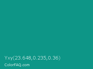 Yxy 23.648,0.235,0.36 Color is a normal cyan color and the nearest color is Gossamer #069b81. Hex code #0d9687 and RGB value is rgb(13,150,135). In RGB color space, this color is composed of 5% red, 59% green, 53% blue, In CMYK color space, this color is composed of 91% cyan, 0% magenta, 10% yellow , 41% black , In HSL color space, this color has a hue angle of 173° , 84% saturation and 32% lightness.