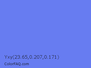 Yxy 23.65,0.207,0.171 Color is a light blue color and the nearest color is Cornflower Blue #6495ed. Hex code #677cf1 and RGB value is rgb(103,124,241). In RGB color space, this color is composed of 40% red, 49% green, 95% blue, In CMYK color space, this color is composed of 57% cyan, 49% magenta, 0% yellow , 5% black , In HSL color space, this color has a hue angle of 231° , 83% saturation and 67% lightness.