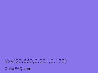 Yxy 23.663,0.231,0.173 Color is a light indigo color and the nearest color is Medium Purple #9370db. Hex code #8a73eb and RGB value is rgb(138,115,235). In RGB color space, this color is composed of 54% red, 45% green, 92% blue, In CMYK color space, this color is composed of 41% cyan, 51% magenta, 0% yellow , 8% black , In HSL color space, this color has a hue angle of 252° , 75% saturation and 69% lightness.