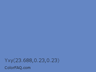 Yxy 23.688,0.23,0.23 Color is a normal blue color and the nearest color is Silver Lake Blue #5d89ba. Hex code #6486c4 and RGB value is rgb(100,134,196). In RGB color space, this color is composed of 39% red, 53% green, 77% blue, In CMYK color space, this color is composed of 49% cyan, 32% magenta, 0% yellow , 23% black , In HSL color space, this color has a hue angle of 219° , 45% saturation and 58% lightness.