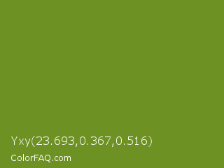 Yxy 23.693,0.367,0.516 Color is a normal lime color and the nearest color is Olive Drab #6b8e23. Hex code #6e9124 and RGB value is rgb(110,145,36). In RGB color space, this color is composed of 43% red, 57% green, 14% blue, In CMYK color space, this color is composed of 24% cyan, 0% magenta, 75% yellow , 43% black , In HSL color space, this color has a hue angle of 79° , 60% saturation and 35% lightness.