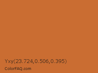 Yxy 23.724,0.506,0.395 Color is a normal orange color and the nearest color is Piper #c96323. Hex code #ca6d32 and RGB value is rgb(202,109,50). In RGB color space, this color is composed of 79% red, 43% green, 20% blue, In CMYK color space, this color is composed of 0% cyan, 46% magenta, 75% yellow , 21% black , In HSL color space, this color has a hue angle of 23° , 60% saturation and 49% lightness.