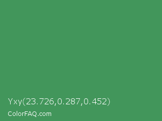 Yxy 23.726,0.287,0.452 Color is a normal green color and the nearest color is Fruit Salad #4f9d5d. Hex code #42965b and RGB value is rgb(66,150,91). In RGB color space, this color is composed of 26% red, 59% green, 36% blue, In CMYK color space, this color is composed of 56% cyan, 0% magenta, 39% yellow , 41% black , In HSL color space, this color has a hue angle of 138° , 39% saturation and 42% lightness.