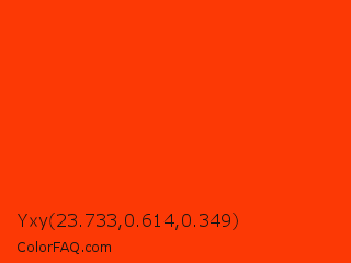 Yxy 23.733,0.614,0.349 Color is a normal red color and the nearest color is Coquelicot #ff3800. Hex code #fc3905 and RGB value is rgb(252,57,5). In RGB color space, this color is composed of 99% red, 22% green, 2% blue, In CMYK color space, this color is composed of 0% cyan, 77% magenta, 98% yellow , 1% black , In HSL color space, this color has a hue angle of 13° , 98% saturation and 50% lightness.