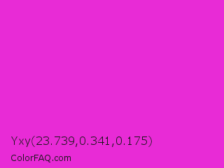 Yxy 23.739,0.341,0.175 Color is a normal magenta color and the nearest color is Razzle Dazzle Rose #ff33cc. Hex code #e82bd6 and RGB value is rgb(232,43,214). In RGB color space, this color is composed of 91% red, 17% green, 84% blue, In CMYK color space, this color is composed of 0% cyan, 81% magenta, 8% yellow , 9% black , In HSL color space, this color has a hue angle of 306° , 80% saturation and 54% lightness.