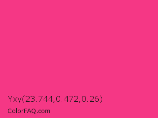 Yxy 23.744,0.472,0.26 Color is a normal rose color and the nearest color is Cerise Pink #ec3b83. Hex code #f53785 and RGB value is rgb(245,55,133). In RGB color space, this color is composed of 96% red, 22% green, 52% blue, In CMYK color space, this color is composed of 0% cyan, 78% magenta, 46% yellow , 4% black , In HSL color space, this color has a hue angle of 335° , 90% saturation and 59% lightness.