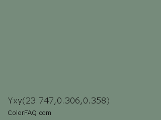 Yxy 23.747,0.306,0.358 Color is a normal green color and the nearest color is Xanadu #738678. Hex code #768b7b and RGB value is rgb(118,139,123). In RGB color space, this color is composed of 46% red, 55% green, 48% blue, In CMYK color space, this color is composed of 15% cyan, 0% magenta, 12% yellow , 45% black , In HSL color space, this color has a hue angle of 134° , 8% saturation and 50% lightness.