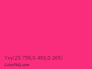 Yxy 23.759,0.493,0.265 Color is a normal rose color and the nearest color is Cerise Pink #ec3b83. Hex code #fa2d7d and RGB value is rgb(250,45,125). In RGB color space, this color is composed of 98% red, 18% green, 49% blue, In CMYK color space, this color is composed of 0% cyan, 82% magenta, 50% yellow , 2% black , In HSL color space, this color has a hue angle of 337° , 95% saturation and 58% lightness.