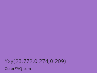 Yxy 23.772,0.274,0.209 Color is a light purple color and the nearest color is Rich Lavender #a76bcf. Hex code #a072ca and RGB value is rgb(160,114,202). In RGB color space, this color is composed of 63% red, 45% green, 79% blue, In CMYK color space, this color is composed of 21% cyan, 44% magenta, 0% yellow , 21% black , In HSL color space, this color has a hue angle of 271° , 45% saturation and 62% lightness.