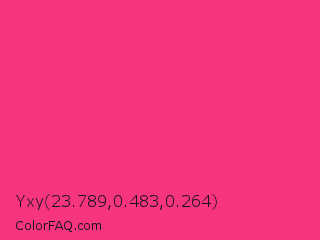 Yxy 23.789,0.483,0.264 Color is a normal rose color and the nearest color is Cerise Pink #ec3b83. Hex code #f73480 and RGB value is rgb(247,52,128). In RGB color space, this color is composed of 97% red, 20% green, 50% blue, In CMYK color space, this color is composed of 0% cyan, 79% magenta, 48% yellow , 3% black , In HSL color space, this color has a hue angle of 337° , 92% saturation and 59% lightness.