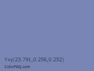Yxy 23.791,0.256,0.252 Color is a normal blue color and the nearest color is Wild Blue Yonder #7a89b8. Hex code #7784b4 and RGB value is rgb(119,132,180). In RGB color space, this color is composed of 47% red, 52% green, 71% blue, In CMYK color space, this color is composed of 34% cyan, 27% magenta, 0% yellow , 29% black , In HSL color space, this color has a hue angle of 227° , 29% saturation and 59% lightness.
