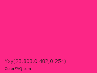 Yxy 23.803,0.482,0.254 Color is a normal rose color and the nearest color is Fluorescent Pink #ff1493. Hex code #fc2686 and RGB value is rgb(252,38,134). In RGB color space, this color is composed of 99% red, 15% green, 53% blue, In CMYK color space, this color is composed of 0% cyan, 85% magenta, 47% yellow , 1% black , In HSL color space, this color has a hue angle of 333° , 97% saturation and 57% lightness.
