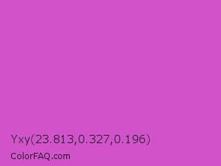 Yxy 23.813,0.327,0.196 Color is a normal magenta color and the nearest color is Fuchsia Pink #c154c1. Hex code #d053c9 and RGB value is rgb(208,83,201). In RGB color space, this color is composed of 82% red, 33% green, 79% blue, In CMYK color space, this color is composed of 0% cyan, 60% magenta, 3% yellow , 18% black , In HSL color space, this color has a hue angle of 303° , 57% saturation and 57% lightness.