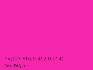 Yxy 23.816,0.412,0.214 Color is a normal magenta color and the nearest color is Persian Rose #fe28a2. Hex code #f526ad and RGB value is rgb(245,38,173). In RGB color space, this color is composed of 96% red, 15% green, 68% blue, In CMYK color space, this color is composed of 0% cyan, 84% magenta, 29% yellow , 4% black , In HSL color space, this color has a hue angle of 321° , 91% saturation and 55% lightness.