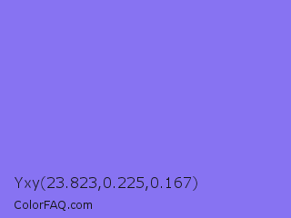 Yxy 23.823,0.225,0.167 Color is a light indigo color and the nearest color is Medium Slate Blue #7b68ee. Hex code #8773f2 and RGB value is rgb(135,115,242). In RGB color space, this color is composed of 53% red, 45% green, 95% blue, In CMYK color space, this color is composed of 44% cyan, 52% magenta, 0% yellow , 5% black , In HSL color space, this color has a hue angle of 249° , 83% saturation and 70% lightness.