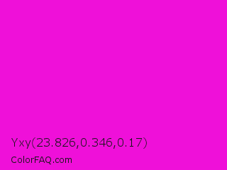 Yxy 23.826,0.346,0.17 Color is a normal magenta color and the nearest color is Hot Magenta #ff1dce. Hex code #ef10d9 and RGB value is rgb(239,16,217). In RGB color space, this color is composed of 94% red, 6% green, 85% blue, In CMYK color space, this color is composed of 0% cyan, 93% magenta, 9% yellow , 6% black , In HSL color space, this color has a hue angle of 306° , 87% saturation and 50% lightness.