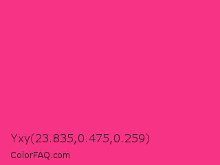 Yxy 23.835,0.475,0.259 Color is a normal rose color and the nearest color is Cerise Pink #ec3b83. Hex code #f73385 and RGB value is rgb(247,51,133). In RGB color space, this color is composed of 97% red, 20% green, 52% blue, In CMYK color space, this color is composed of 0% cyan, 79% magenta, 46% yellow , 3% black , In HSL color space, this color has a hue angle of 335° , 92% saturation and 58% lightness.