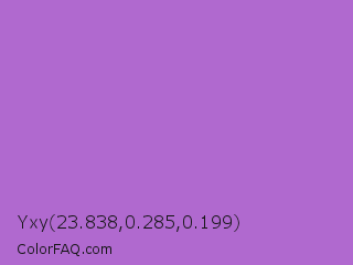 Yxy 23.838,0.285,0.199 Color is a light purple color and the nearest color is Rich Lilac #b666d2. Hex code #b069cf and RGB value is rgb(176,105,207). In RGB color space, this color is composed of 69% red, 41% green, 81% blue, In CMYK color space, this color is composed of 15% cyan, 49% magenta, 0% yellow , 19% black , In HSL color space, this color has a hue angle of 282° , 52% saturation and 61% lightness.