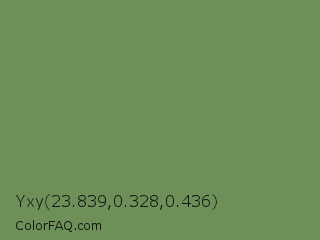 Yxy 23.839,0.328,0.436 Color is a normal green color and the nearest color is Highland #6f8e63. Hex code #6c9058 and RGB value is rgb(108,144,88). In RGB color space, this color is composed of 42% red, 56% green, 35% blue, In CMYK color space, this color is composed of 25% cyan, 0% magenta, 39% yellow , 44% black , In HSL color space, this color has a hue angle of 99° , 24% saturation and 45% lightness.
