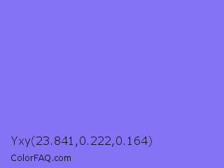 Yxy 23.841,0.222,0.164 Color is a light indigo color and the nearest color is Medium Slate Blue #7b68ee. Hex code #8573f5 and RGB value is rgb(133,115,245). In RGB color space, this color is composed of 52% red, 45% green, 96% blue, In CMYK color space, this color is composed of 46% cyan, 53% magenta, 0% yellow , 4% black , In HSL color space, this color has a hue angle of 248° , 87% saturation and 71% lightness.
