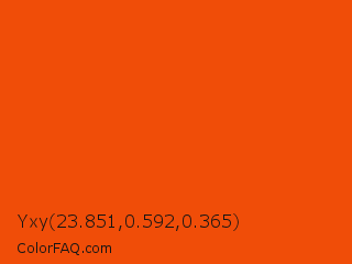 Yxy 23.851,0.592,0.365 Color is a normal orange color and the nearest color is Trinidad #e64e03. Hex code #f04d08 and RGB value is rgb(240,77,8). In RGB color space, this color is composed of 94% red, 30% green, 3% blue, In CMYK color space, this color is composed of 0% cyan, 68% magenta, 97% yellow , 6% black , In HSL color space, this color has a hue angle of 18° , 94% saturation and 49% lightness.