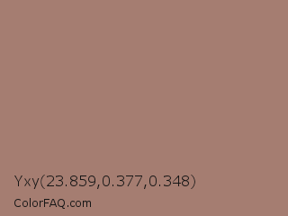 Yxy 23.859,0.377,0.348 Color is a normal red color and the nearest color is Burnished Brown #a17a74. Hex code #a57d71 and RGB value is rgb(165,125,113). In RGB color space, this color is composed of 65% red, 49% green, 44% blue, In CMYK color space, this color is composed of 0% cyan, 24% magenta, 32% yellow , 35% black , In HSL color space, this color has a hue angle of 14° , 22% saturation and 55% lightness.