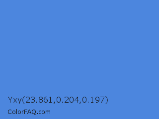 Yxy 23.861,0.204,0.197 Color is a normal blue color and the nearest color is Havelock Blue #5590d9. Hex code #4c86de and RGB value is rgb(76,134,222). In RGB color space, this color is composed of 30% red, 53% green, 87% blue, In CMYK color space, this color is composed of 66% cyan, 40% magenta, 0% yellow , 13% black , In HSL color space, this color has a hue angle of 216° , 69% saturation and 58% lightness.