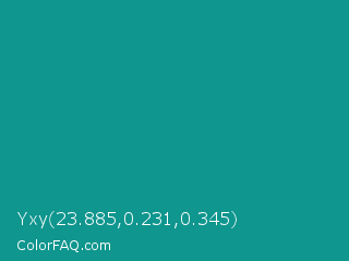 Yxy 23.885,0.231,0.345 Color is a normal cyan color and the nearest color is Blue Chill #0c8990. Hex code #0f968e and RGB value is rgb(15,150,142). In RGB color space, this color is composed of 6% red, 59% green, 56% blue, In CMYK color space, this color is composed of 90% cyan, 0% magenta, 5% yellow , 41% black , In HSL color space, this color has a hue angle of 176° , 82% saturation and 32% lightness.